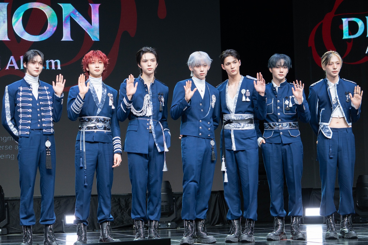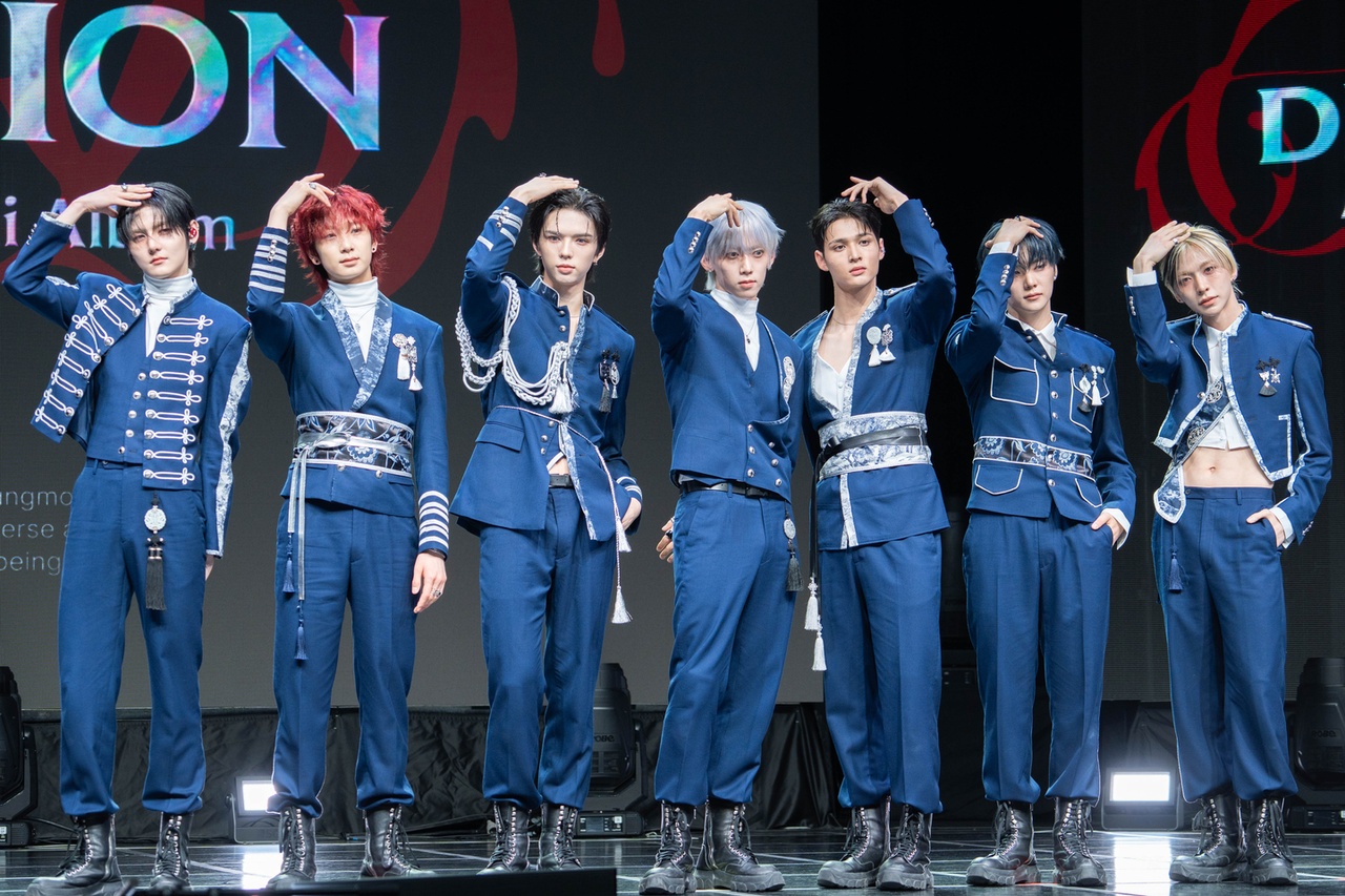“The lead track, ‘God,’ has an intense Asian flair built on top of a trendy trap beat, which I think can be described as Joseon Dynasty hip-hop,” said leader Kamden during a press showcase at Nodeul Live House in Yongsan District, central Seoul, on Wednesday, ahead of the release of its fourth EP, Definition,” at 6 p.m. that day.