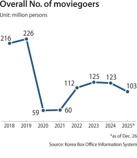 The total number of moviegoers this year stood slightly over 103 million as of Friday, a precipitous drop from the more than 123 million recorded the previous year.