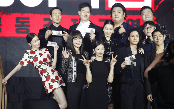 The cast of “Money Heist: Korea – Joint Economic Area” poses for the camera at the press event to promote its series, which releases on Netflix Friday. [NEWS1]