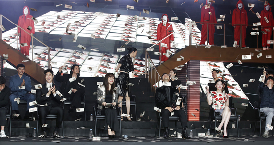 The cast of “Money Heist: Korea – Joint Economic Area” grab bills falling from the money shower at the press event hosted by Netflix Korea at Coex in southern Seoul on Wednesday. [NEWS1]