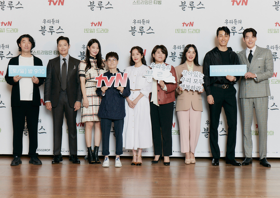 The creators and the cast of upcoming tvN drama series “Our Blues” — from left, producer Kim Gyu-tae, actors Lee Byung-hun, Shin Min-a, writer Noh Hee-gyoung, actors Han Ji-min, Lee Jung-eun, Uhm Jung-hwa, Cha Seung-won and Kim Woo-bin — pose for the camera prior to an online press event Thursday. The series revolves around the narratives and relationships of 14 characters living in a seaside town in Jeju Island. The series begins airing Saturday. [TVN]
