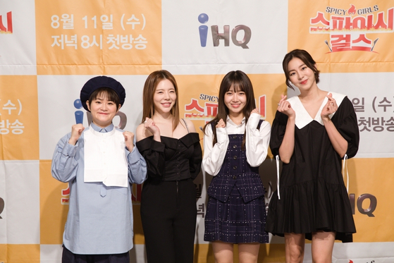 From left, comedian Kim Shin-young, singers Sunny of Girls’ Generation, Choi Yoo-jung of Weki Meki, and Uee of After School pose for a photo on Wednesday at an online press event for the food variety show “Spicy Girls” airing on IHQ. The cast will embark on a food tour to try spicy dishes. [IHQ]
