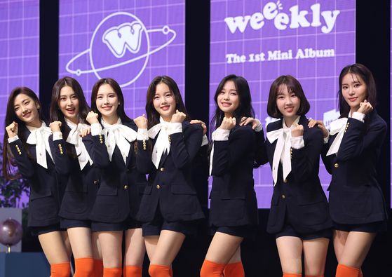 Girl group Weeekly poses for photos on Tuesday during its debut showcase held at Shinhan Card Fan Square in western Seoul. Weeekly is the first girl group to debut under PlayM Entertainment in 10 years, after Apink made its debut in 2011. Its first EP, "We Are," includes the funky dance track, "Tag Me (@Me)." [ILGAN SPORTS]
