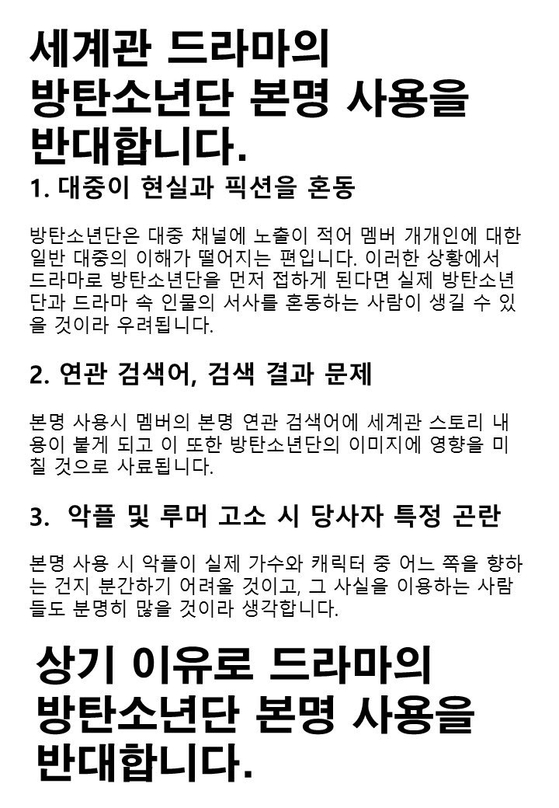 “We oppose the usage of the real names of BTS in the BU drama,” reads an image that thousands of fans have unanimously uploaded since Monday through Twitter, with the hashtag “no_to_drama_real_name” (translated). Fans explained that the public will easily confuse the real BTS with the fictional background story, thinking that the story is true, and having the characters’ names searched on the internet will create a chaotic distraction for both the drama and the members of BTS.