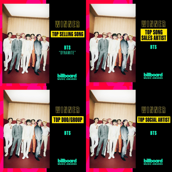 BTS nabbed the Top Duo/Group, Top Song Sales Artist, Top Social Artist, and Top Selling Song awards at the 2021 Billboard Music Awards (BBMA) held on Monday, Korean time, setting a record for not only itself but for all of K-pop.