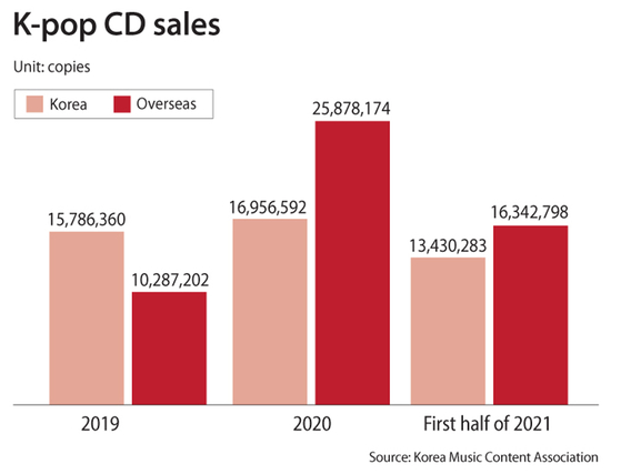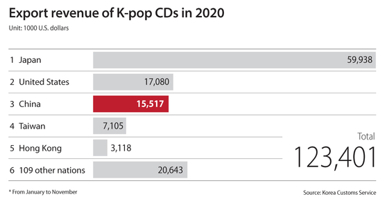According to the Korea Customs Service, export revenue from global K-pop CD sales in 2020 rose by 78.2 percent compared to 2019. While the amount increased by 93.4 percent in Japan and 117.2 percent in the United States, it only grew by 26.9 percent in China.