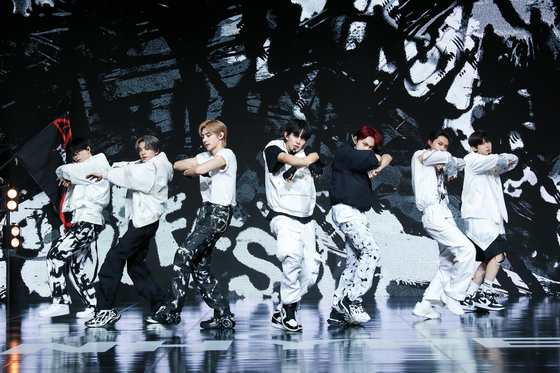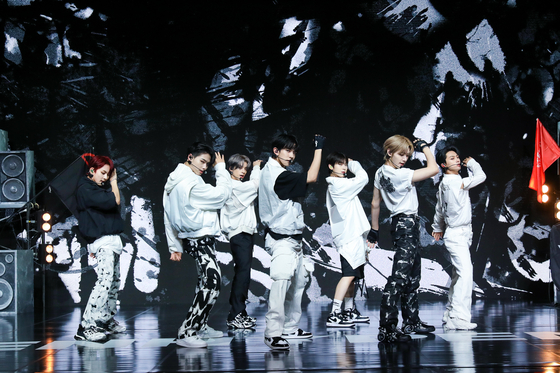 The team of seven — Jungwon, Heeseung, Jay, Jake, Sunghoon, Sunoo and Ni-ki — showcased its new lead track “Future Perfect (Pass the MIC)” live on stage. The song combines old school hip-hop with drill, a subgenre of trap music.