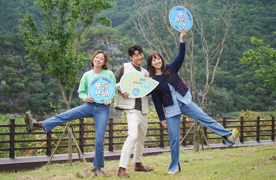 From left, actors Gong Hyo-jin, Lee Chun-hee and Jeon Hye-jin pose during Thursday’s online press conference for the new KBS entertainment show “From Today, Harmlessly” (translated). In the program, the celebrities will challenge themselves to living in nature while minimizing their carbon footprint, aiming to highlight environmental issues. [KBS]