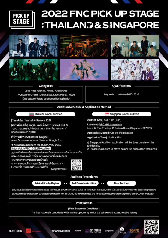 The schedules for "2022 FNC Pick Up Stage: Thailand & Singapore" may change depending on the Covid-19 situation. For more information, visit the audition's official website, www.fnc-audition.com.
