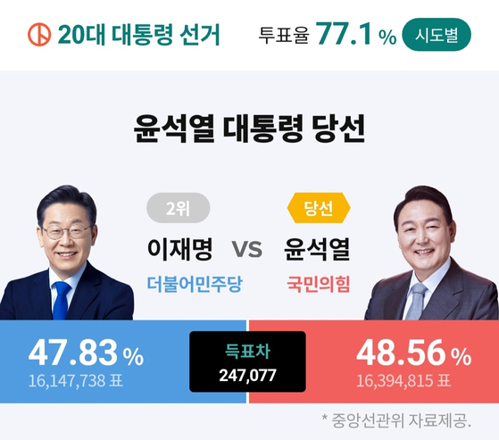 President Moon received 41.08 percent votes in 2017 while the runner-up received 24.03 percent. This year, the winning candidate Yoon earned 48.56 percent of votes and the runner-up Lee earned 47.83 percent. The margin was so slim that there were more invalid ballots (307,542) than the difference in votes for Yoon and Lee (247,077). In fact, this year's presidential election was dubbed the "unlikeable election" because both of the top two candidates had their fair share of controversies.