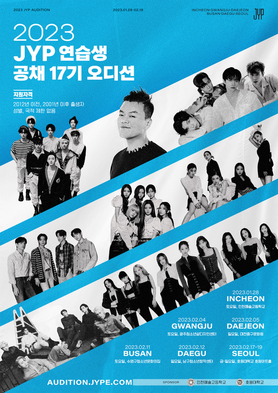 JYP Entertainment will host auditions in six cities in Korea — Incheon at the Incheon Arts High School on Jan. 28, 2023; Gwangju at Samdi (Gwangju Youth Creative Hub) on Feb. 4, Daejeon at the Junggu Cultural Center on Feb. 5, Busan at the Suyeong District Youth Culture Center on Feb. 11, Daegu at the Namgu Youth Creation Center on Feb. 12 and Seoul at the Howon Art Hall between Jan. 17 and 19.