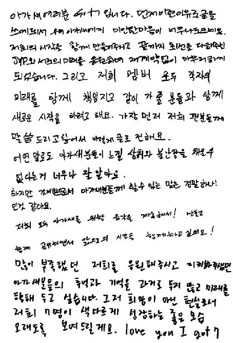 Members posted a handwritten letter on Jan. 19 addressed to their fan club Ahgase. Each member wrote several sentences, saying how sorry they were to be parting ways without renewing their contract with JYP Entertainment and that though they are going their separate ways, “we cheer on each other’s futures.”