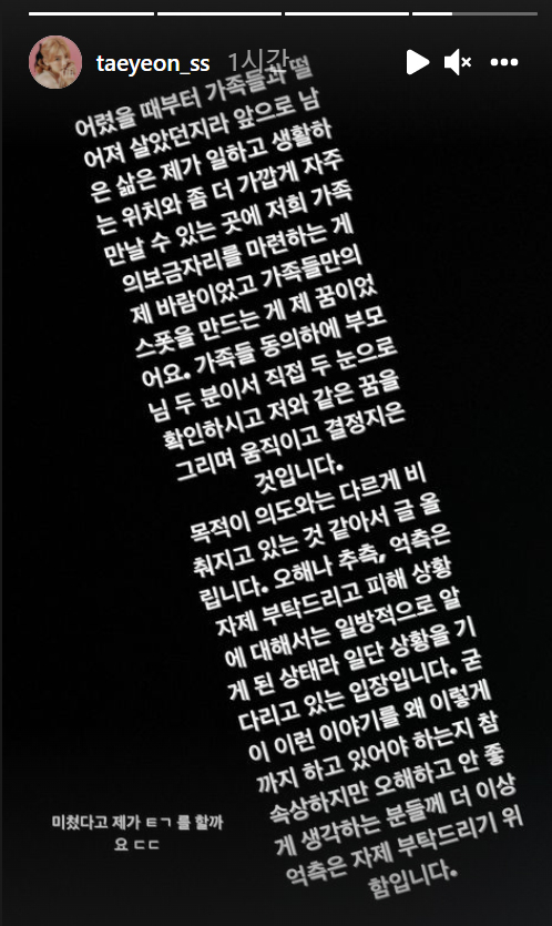 However, the statement actually worsened the public sentiment toward her and led to more questions about why she had bought undevelopable land to build a house for her family. The general public and fans alike are pointing out that purchasing real estate based on insider information about future development is the definition of speculation. Taeyeon's statement about her intentions to build a house on that land unintentionally became a sort of confession that she expected regulations on the forest reserve to be lifted in the near future.
