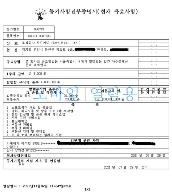 "DK's company is probably only in name, since its business is all over the place according to the registration: software development, film production, management consulting, telemarketing, real estate affairs and more," said attorney Kim. "Corporations do enjoy significant tax benefits compared to individuals, so if DK's company isn't in business at all, it may be considered tax evasion and be subject to an investigation by the National Tax Service."
