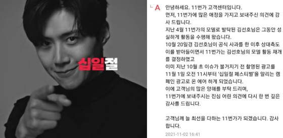The disdain led some to file customer complaints toward 11th Street for resuming ads in which Kim appear. According to a screenshot of 11th Street’s response to the complaint, posted online on Tuesday by a netizen who filed it, the online retailer explained, “Kim’s ex-girlfriend accepted his apology and the advertisement was filmed before the controversy surfaced, so we decided to resume Kim’s activities as our ad model. We kindly ask for your understanding.”