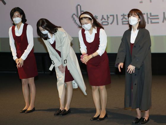 Actors Park Hye-soo, Go Ah-sung, Lee Som and Lee Joo-young met the audience of the film “Samjin Company English Class” at the multiplex theater CGV Yongsan in central Seoul on Sunday afternoon. As a rare Korean film led only by female characters without any romance, “Samjin Company English Class” attracted 1.19 million viewers in total as of Saturday, after being released on Oct. 21. The film, set in the mid-1990s, tells the story of three female employees of a large company who find and try to uncover the massive corruption that lies behind the company’s dumping of toxins into a river. [ILGAN SPORTS]