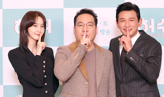From left, singer-turned-actor Lim Yoon-A, producer Choi Kyu-sik and actor Hwang Jung-min pose for a photograph after an online press conference held Thursday for their upcoming weekend drama series "Hush."