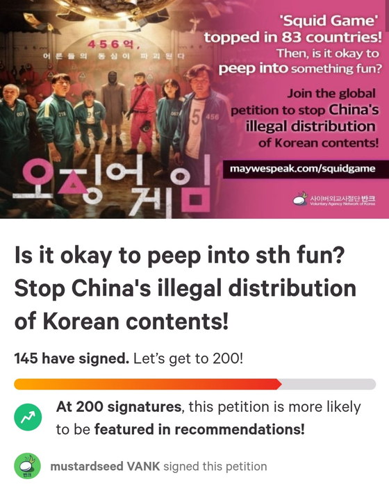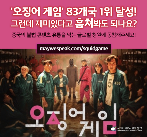 On social media platforms, VANK is distributing an image that features a promotional image for “Squid Game” with cations that read, “'Squid Game’ topped in 83 countries! Then, is it okay to peep into something fun? Join the global petition to stop China’s illegal distribution of Korean contents!” in Korean and English.