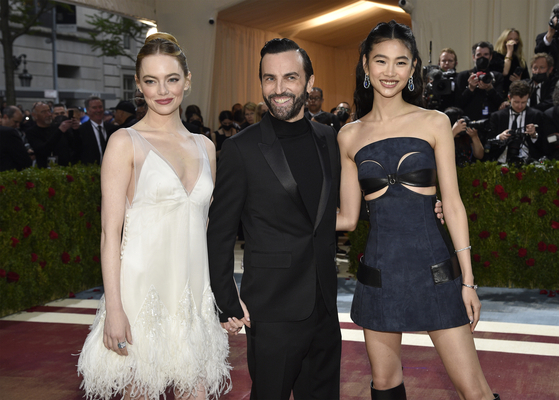 왼쪽부터 엠마 스톤, 니콜라스 제스키에르 그리고 정호연이 월요일 2022년 5월 2일 뉴욕의 멧 갈라 행사에 참석한다.