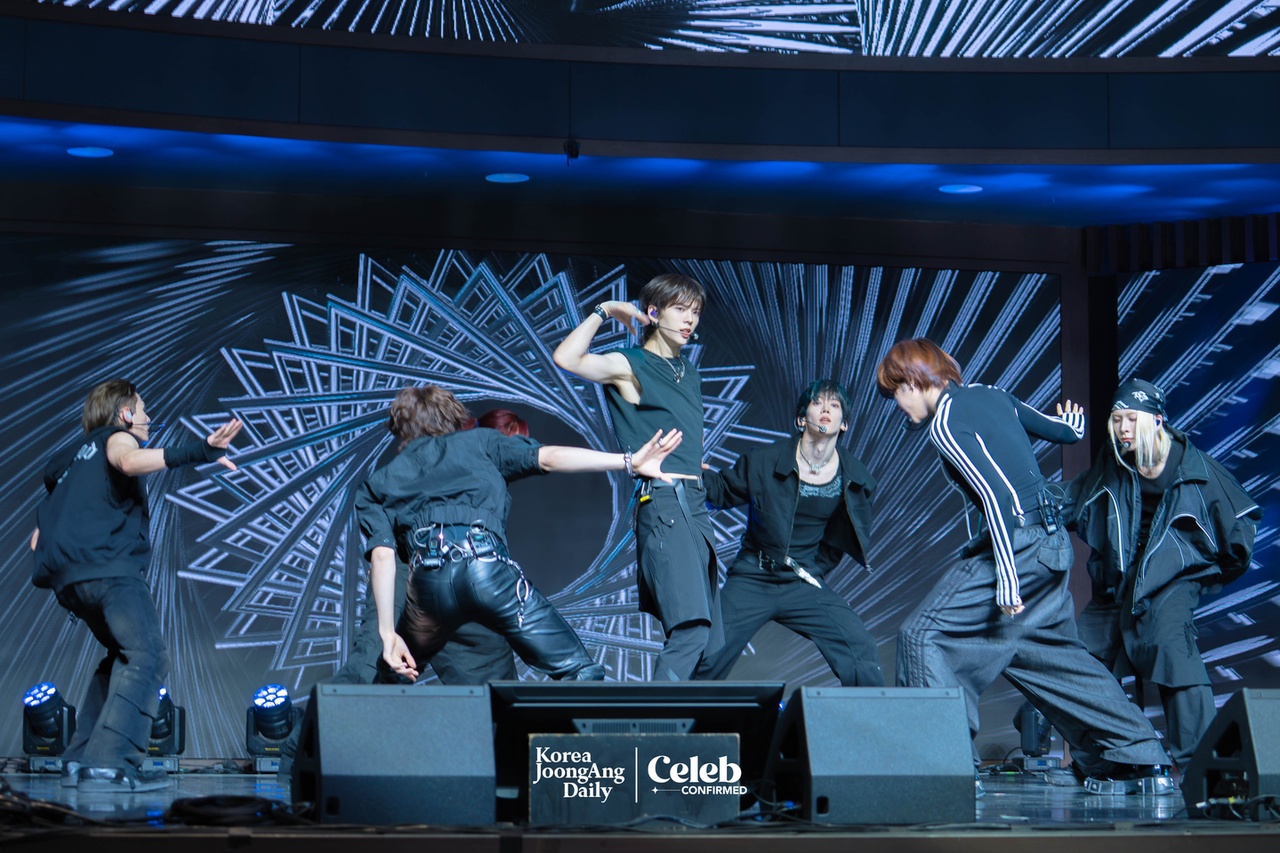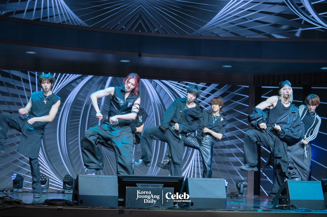Boy band Ampers&One performs B-side “Seesaw” during a showcase for the release of its third EP, ″Loud & Proud,″ at the Sky Art Hall in western Seoul on Aug. 12. [DANIELA GONZALEZ PEREZ]