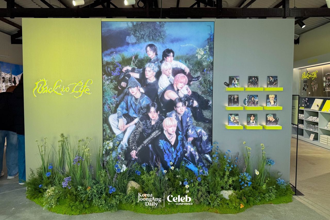 The “Back to Life” pop-up store opened on Tuesday and runs for a week, and does not require a reservation for entry. The space reflects the album’s concept, featuring a palette of gray and vibrant green, adorned with flowers that mirror the aesthetic of the album’s concept photos.