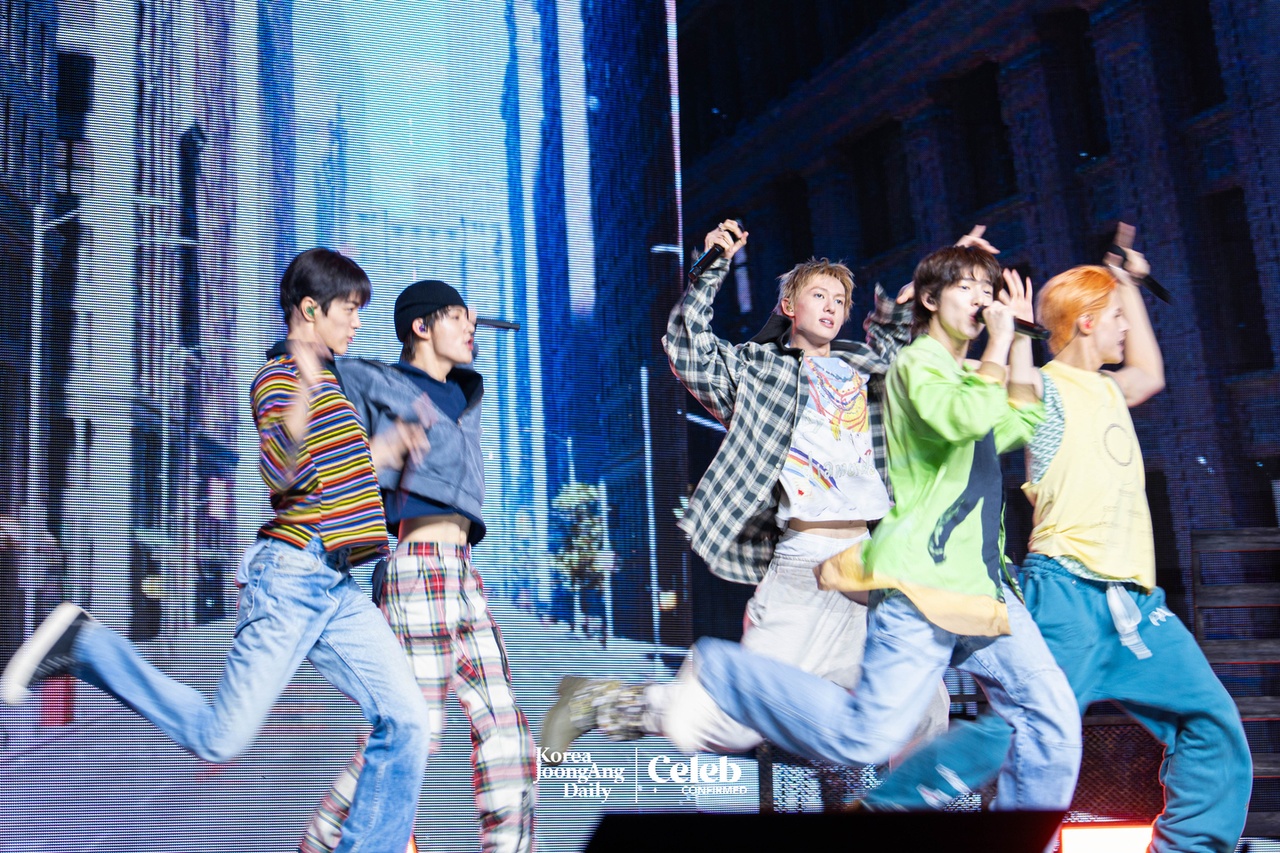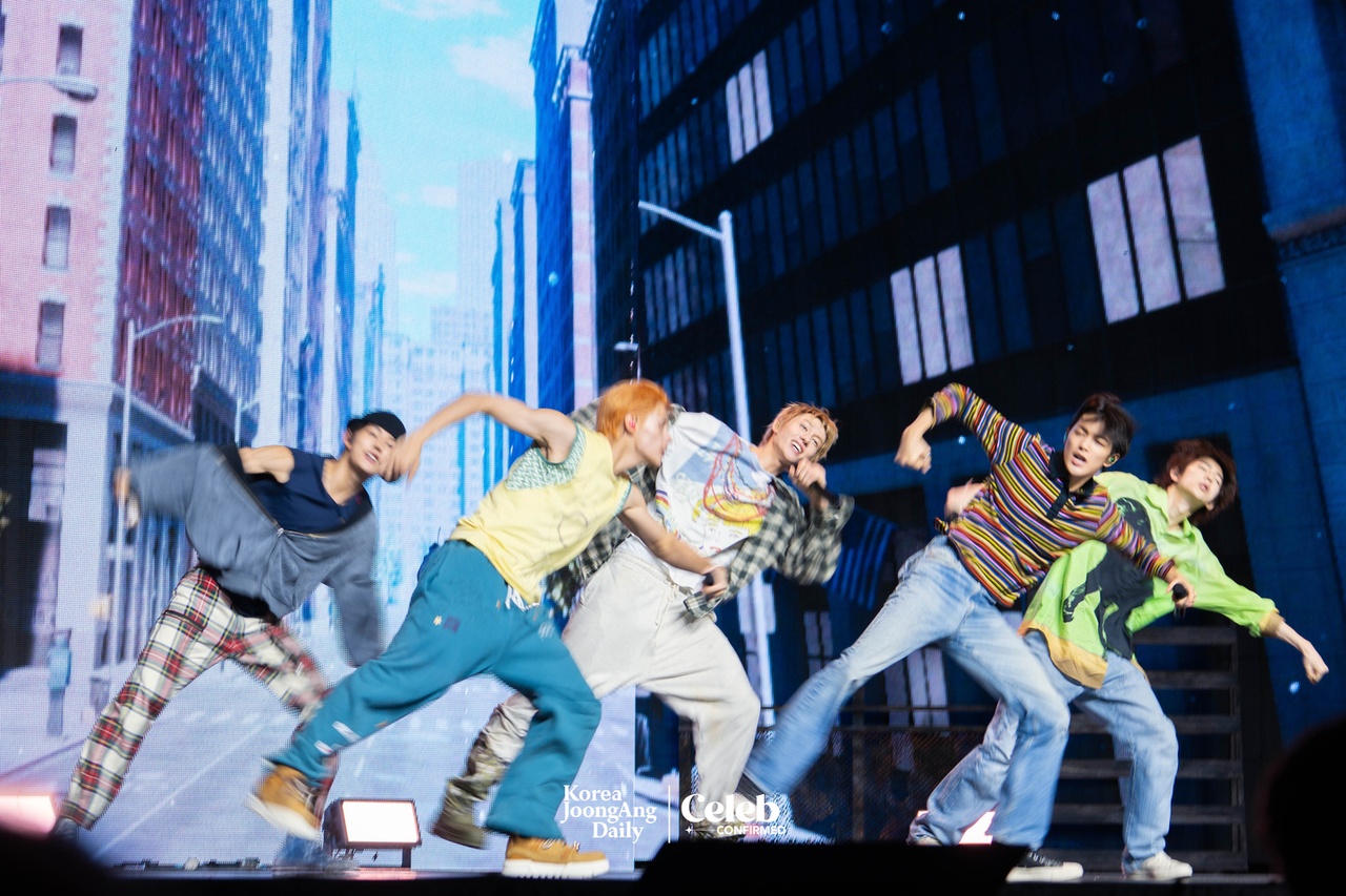 Boy band Cortis performs lead track “What You Want” during a showcase for the release of its first EP, ″Color Outside the Lines,″ at the Blue Square in central Seoul on Aug. 18. [DANIELA GONZALEZ PEREZ]