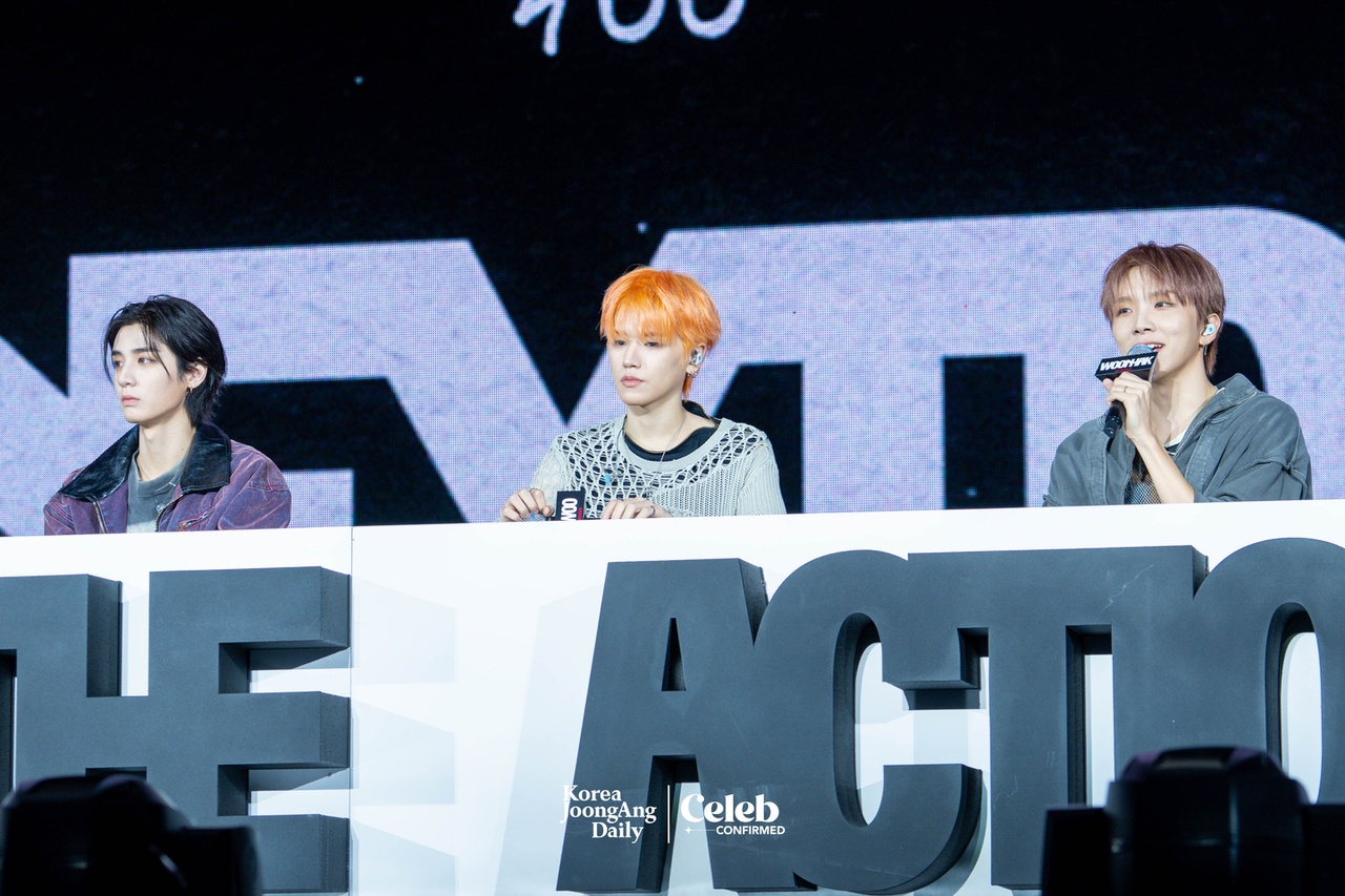 During the media event, the six-member group — Sungho, Riwoo, Myung Jae-hyun, Taesan, Leehan and Woonhak — performed the lead track “Hollywood Action” and answered questions from reporters.
