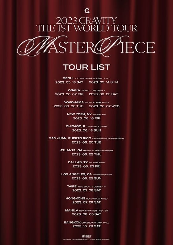 Boy band Cravity will stop in six Asian and six North American cities for its first world tour titled “Masterpiece,” its agency Starship Entertainment announced Tuesday.