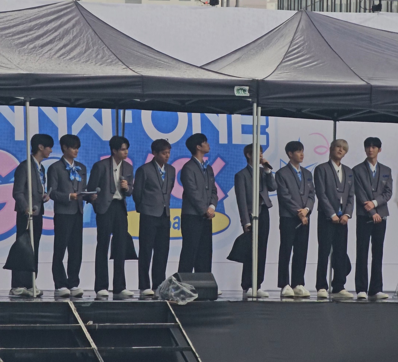 While all 11 members left handwritten messages for fans on social media ahead of the show’s premiere, only nine were present for the meet and greet. Kang was absent due to military service, while Lai remained in China. In their place, life-size standing panels of the two members were displayed beside the group.