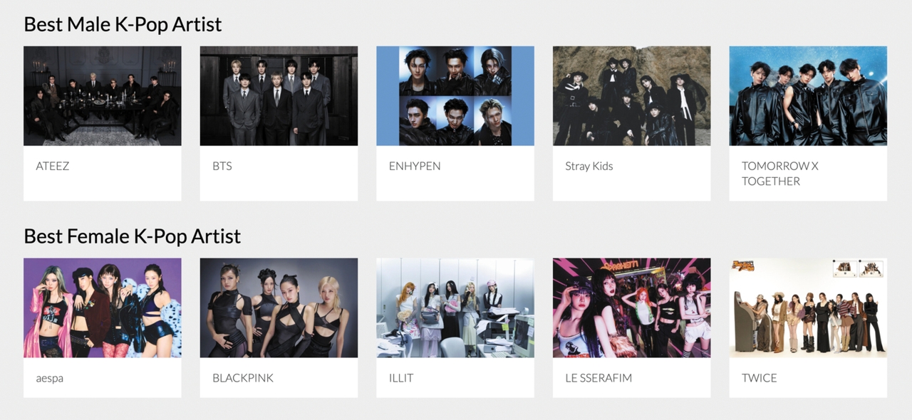 In two separate best K-pop artist categories, divided between men and women, 10 groups — five boy bands and five girl groups — earned nominations. For the men, the contenders are Ateez, BTS, Enhypen, Stray Kids and Tomorrow X Together. For the women, the competition is among Blackpink, ILLIT, Le Sserafim and Twice.