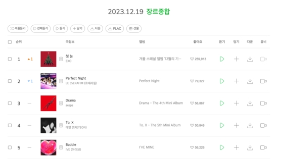 "The First Snow," EXO's 10-year-old winter-themed song released back in 2013, climbed up the charts and sat atop Melon's Top 100 as of Sunday and Melon's Daily chart on Wednesday — making it the first time the song ranked No. 1 on Melon's charts since its release 10 years ago, and the first boy band track in 2023 to top Melon's Daily chart.