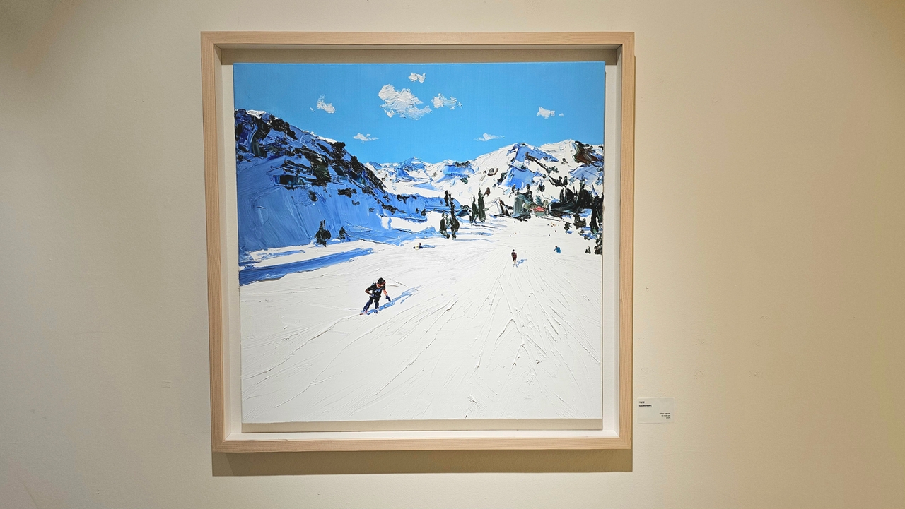 Lee’s works explore the symbiotic rhythm between humans and the natural environment through moments of leisure, such as skiers gliding down snowy mountains or figures lying on sandy beaches.
