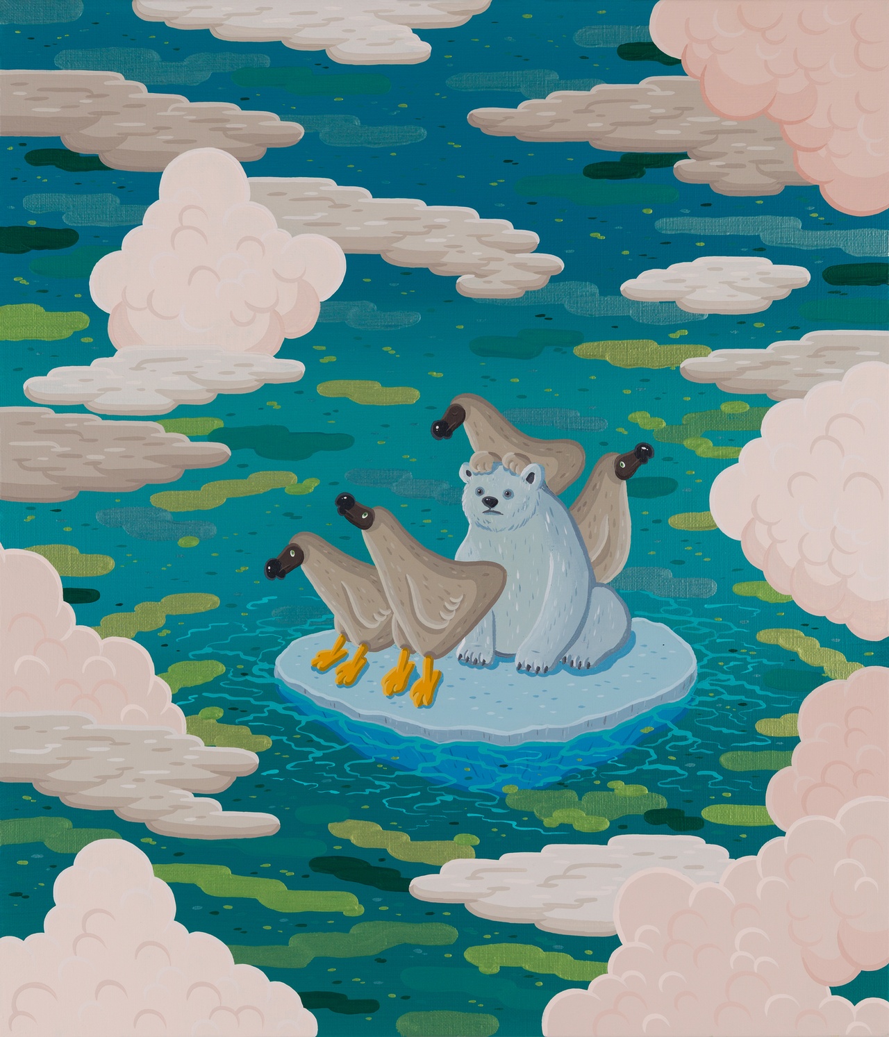 Deeper inside the gallery, Kim’s works capture attention through their direct storytelling of environmental crisis, symbolized by the dodo, the extinct flightless bird that recurs throughout his collection. “Vanishing Home” (2025) presents a straightforward narrative with a polar bear perched on a melting piece of ice, surrounded by dodos, highlighting the loss of habitats and species.