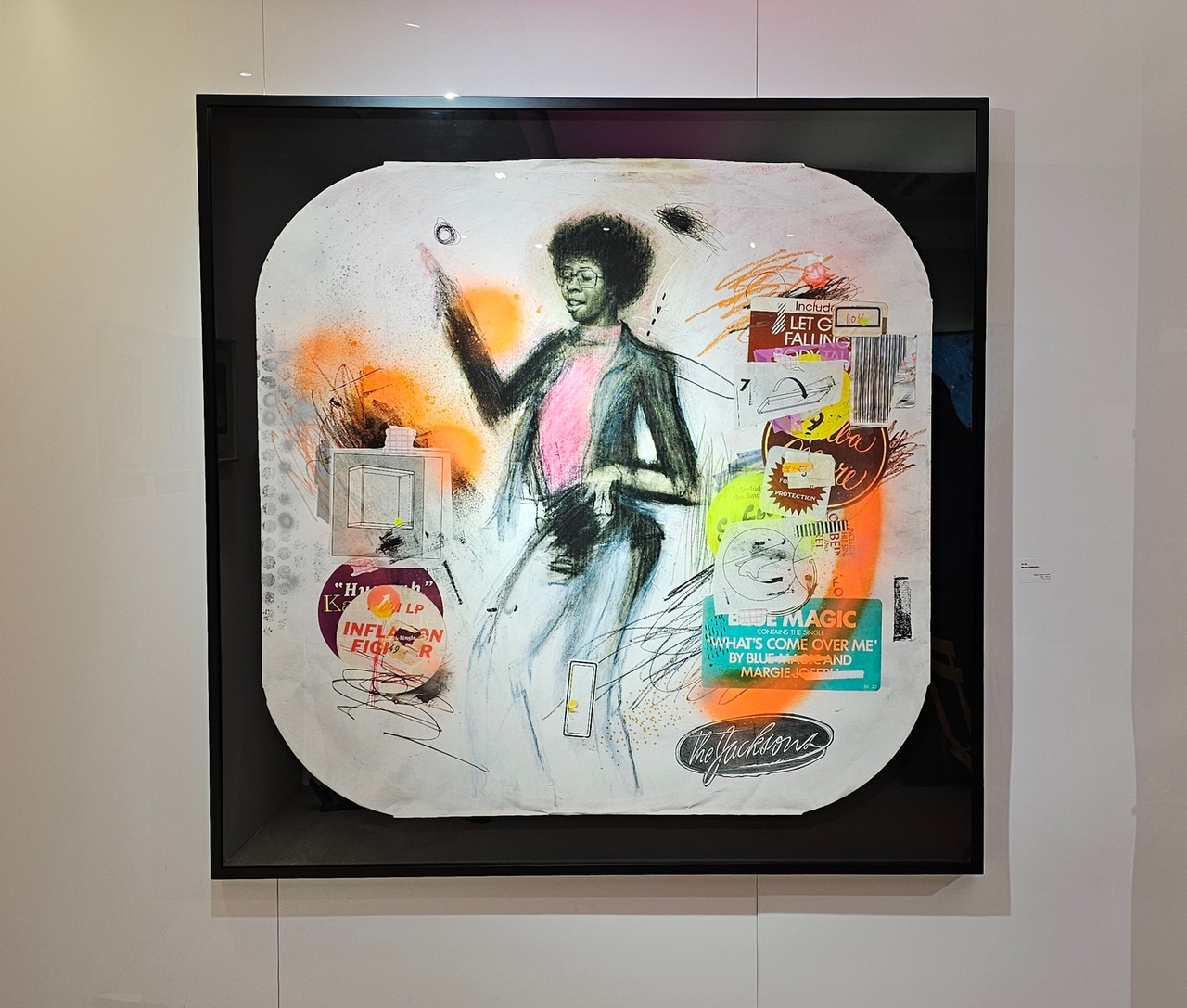 Yoo’s collage-based artworks take a different approach as the artist puts together discarded objects to explore themes of balance and existence. In “Music Industry 2” (2025), Yoo used an inner sleeve for a vinyl record, representing a bygone era in the music industry, paired with an image of a musician appearing on the iconic U.S. music show “Soul Train” (1971-2006), creating a layered commentary on the changing industrial landscape in the music scene.