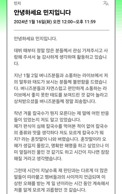 Minji, on Jan. 2, 2024, addressed the year-old kalguksu incident during a Weverse livestream with fellow NewJeans members.