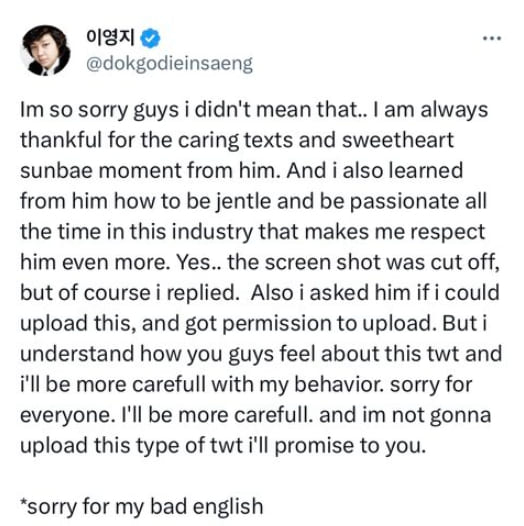 Rapper Lee Young-ji kicked off 2024 with a Jan. 1 apology to fans of Seventeen for purportedly ignoring text messages from band member Dogyeom.
