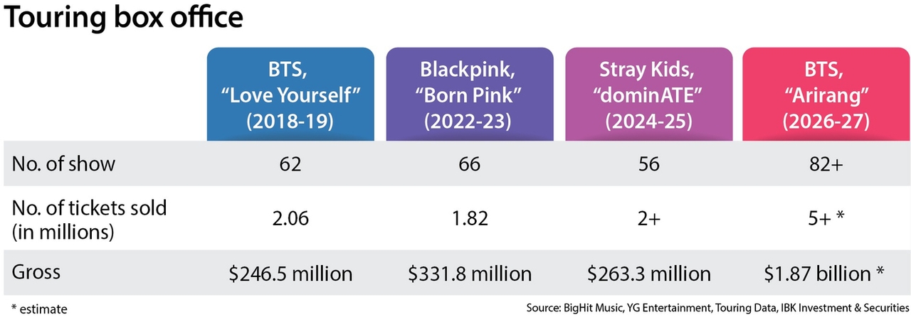 The group’s “Arirang” tour is already billed as K-pop’s largest yet, with at least 82 shows across 34 stops. IBK Investment & Securities expected the tour to gross 2 billion won ($1.87 billion) in revenue, including concert merchandise sales throughout 2027 with total attendance reaching 5 million — which means it will easily eclipse any previous records set by K-pop acts.