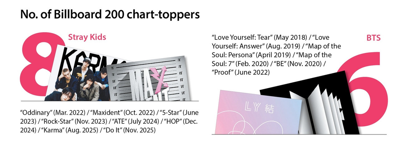 And then Stray Kids recently made headlines by debuting at No. 1 on the Billboard 200 with eight consecutive releases, from its sixth EP “Oddinary” (2022) through the fourth full-length album “Karma” (2025) and special release “Do It” (2025).
