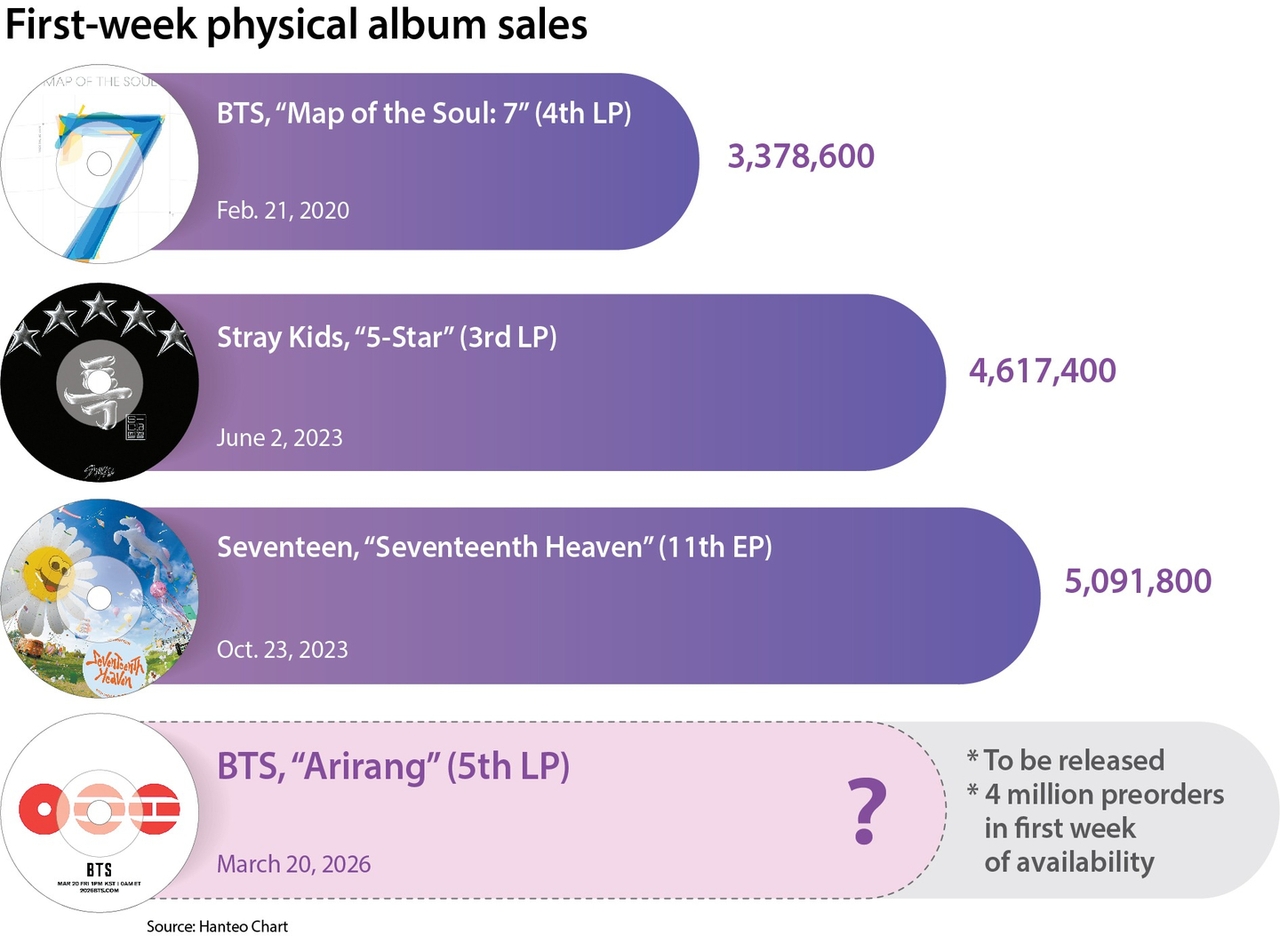 In this stagnated market, BTS’s “Arirang” already logged 4.06 million preorders within a week of opening orders. While susceptible to external factors such as logistics, the final tally is highly likely to surpass the group’s previous record set by “Map of the Soul: 7,” and may once again cross the 4 million threshold — or even the 5 million mark — despite the changed landscape.