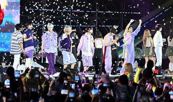 The lineup of 20 K-pop acts took the stage at the "K-pop Super Live" concert included IVE, NewJeans, NCT Dream, ITZY, Mamamoo, The Boyz, Shownu & Hyungwon, fromis_9, ZeroBaseOne, P1Harmony, KARD, The New Six, ATBO, xikers, Holybang, Libelante and Fortena, as well as singers Kang Daniel, Kwon Eun-bi and Jo Yuri.