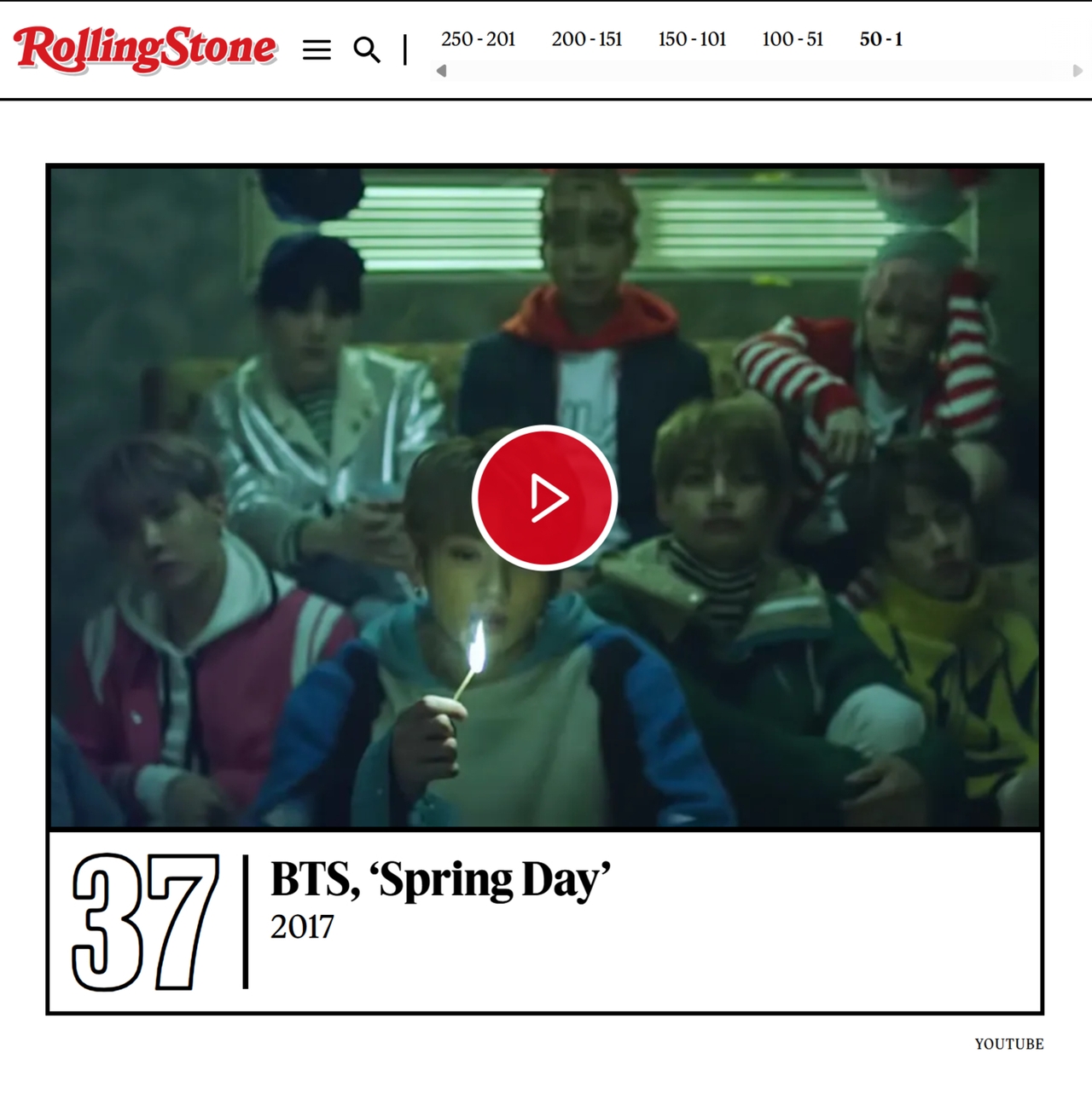 The highest rank on the list by a K-pop song was BTS's "Spring Day" (2017) on No. 37, "a signature song for one of the century’s biggest pop acts" as dubbed by the magazine. Rolling Stone explained the song's authenticity in connection with the 2014 sinking of the Sewol Ferry and explained that the song's "sense of resilience and hope wrought from loss has a transcendent feel, soon to be mirrored in the band’s global takeover."