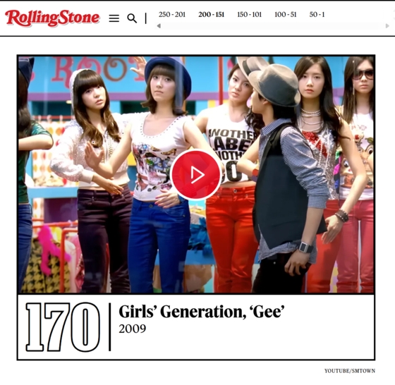 On No. 170 was Girls' Generation's "Gee" (2009), which was described as personifying a very Korean term referred to as "aegyo," which Rolling Stone described as "the use of cute, childlike mannerisms to charm others." The attribution to "Gee" focused more on the aesthetics than the quality or meaning of the music — rightly so for a K-pop song whose sole purpose is to be a catchy earworm to listeners.