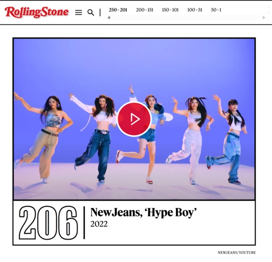 The youngest K-pop group to be named on the list was girl group NewJeans, whose 2022 hit dance track "Hype Boy" sat on No. 206 of the Rolling Stone list.