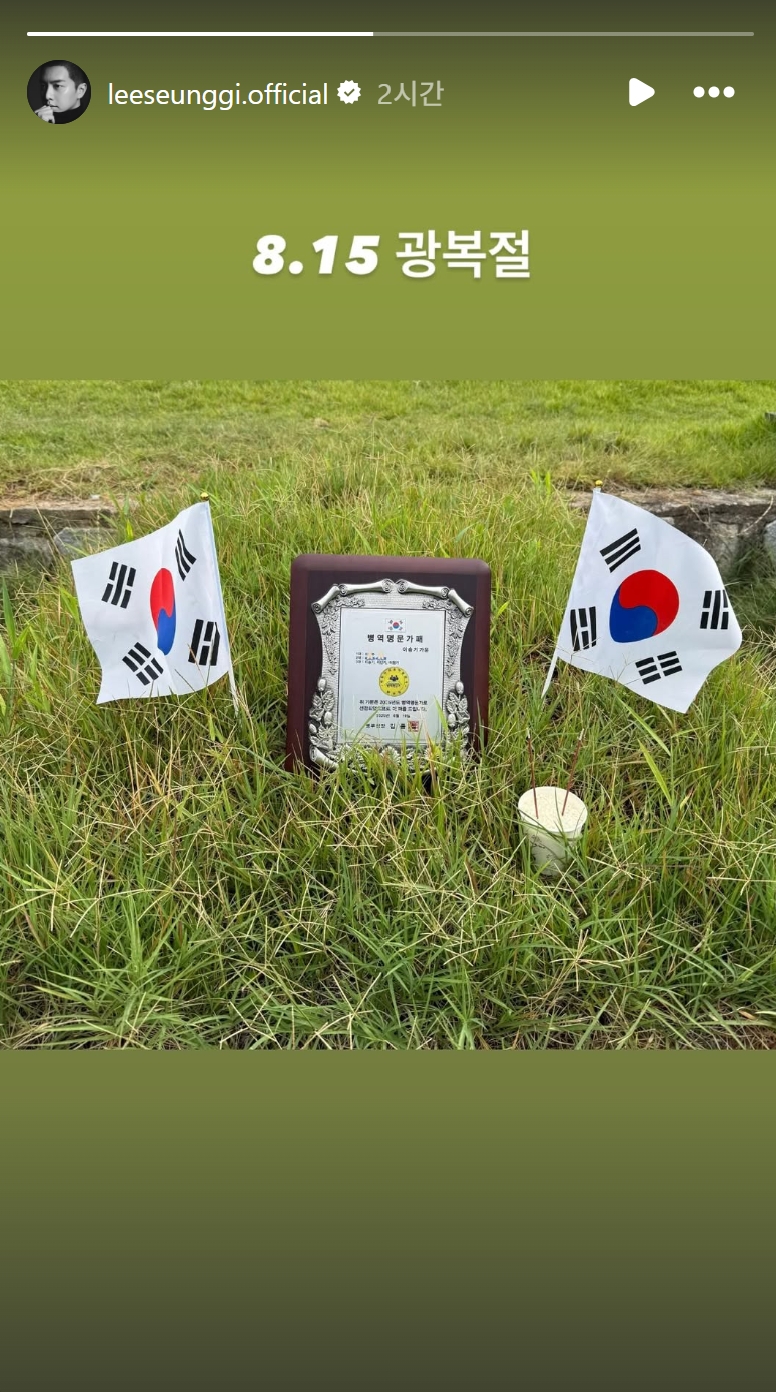 Lee shared an image on his Instagram Story on Friday along with the caption, “Aug. 15, Liberation Day.” The photo shows Lee visiting a family grave site adorned with the Taegeukgi, or the Korean national flag, and a framed certificate.