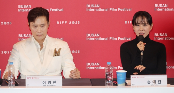 Actor Lee Byung-hun, left, and actor Son Ye-jin, at a press conference for director Park Chan-wook's film "No Other Choice," the opener for the Busan International Film Festival, held at the Busan Cinema Center in Haeundae District, Busan, on Sept. 17 [SONG BONG-GEUN]