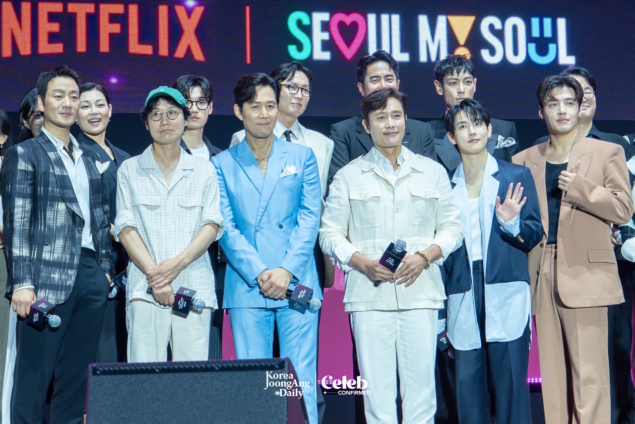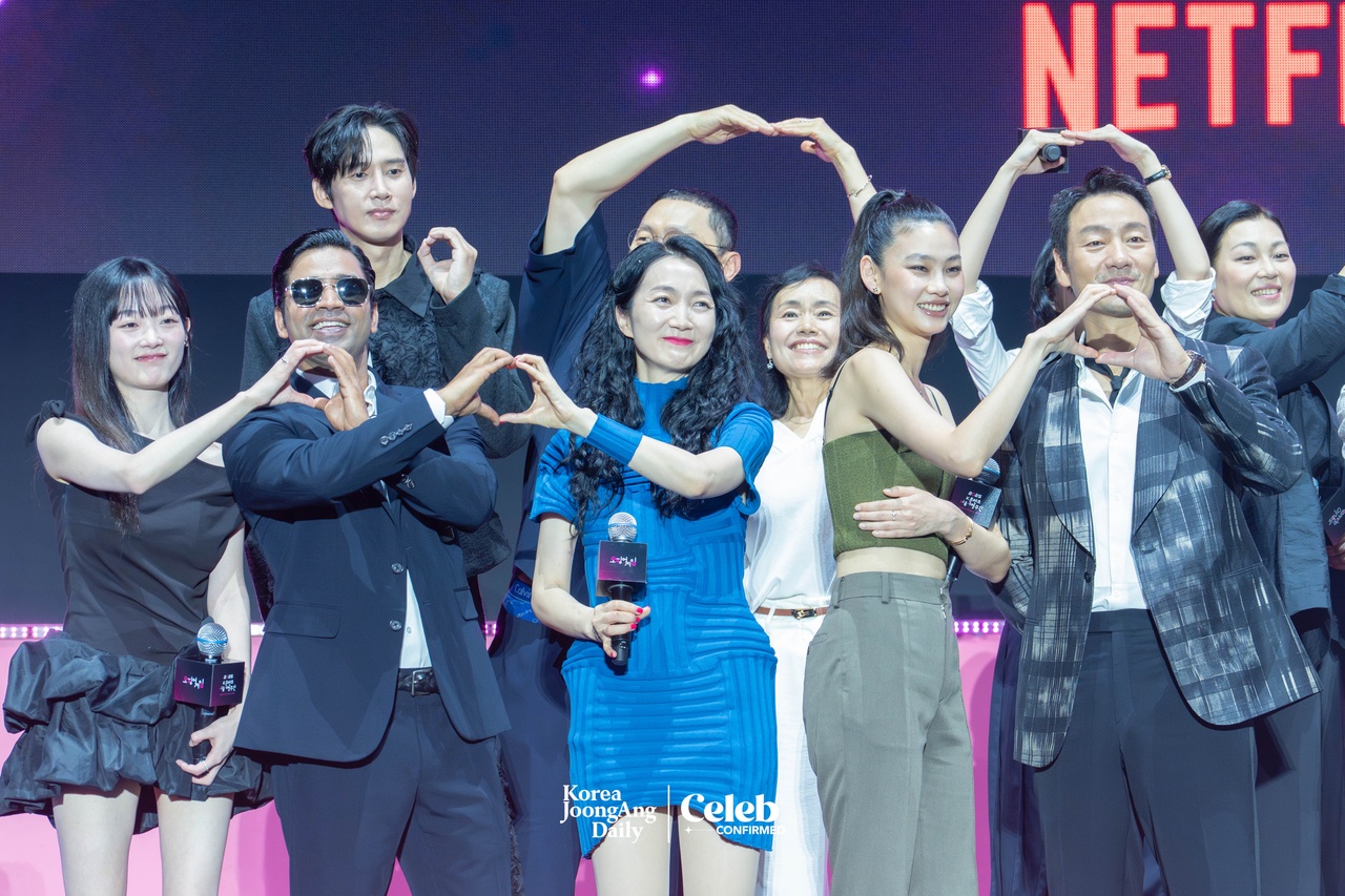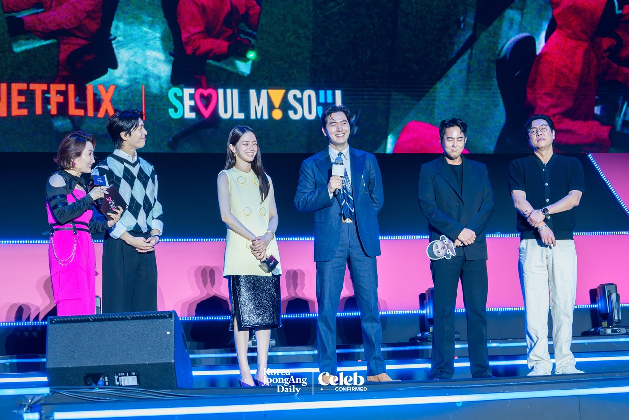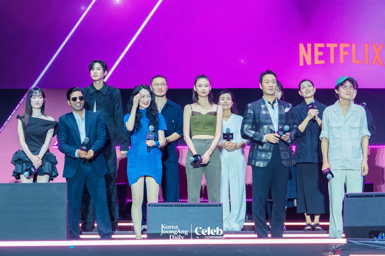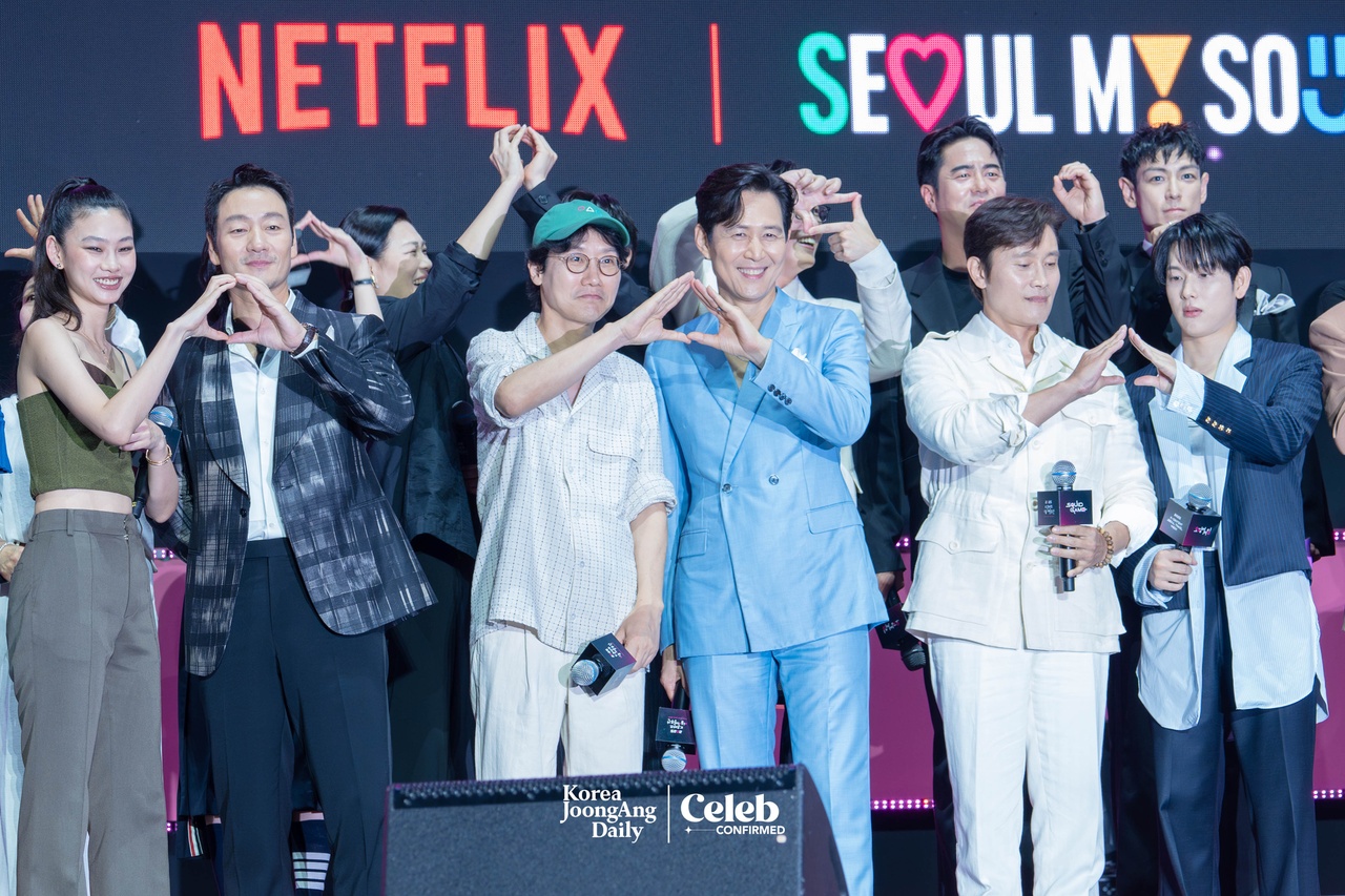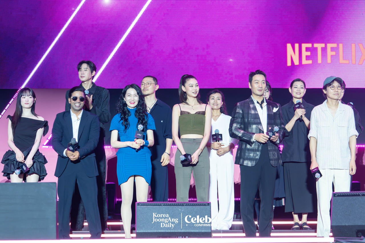 The cast of the third season of “Squid Game” during a fan event for the release of the third season of “Squid Game” (2021-) at Seoul Plaza in central Seoul on June 28. [DANIELA GONZALEZ PEREZ]