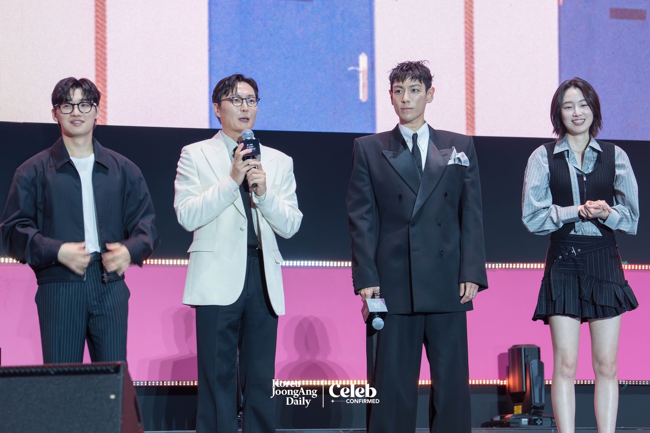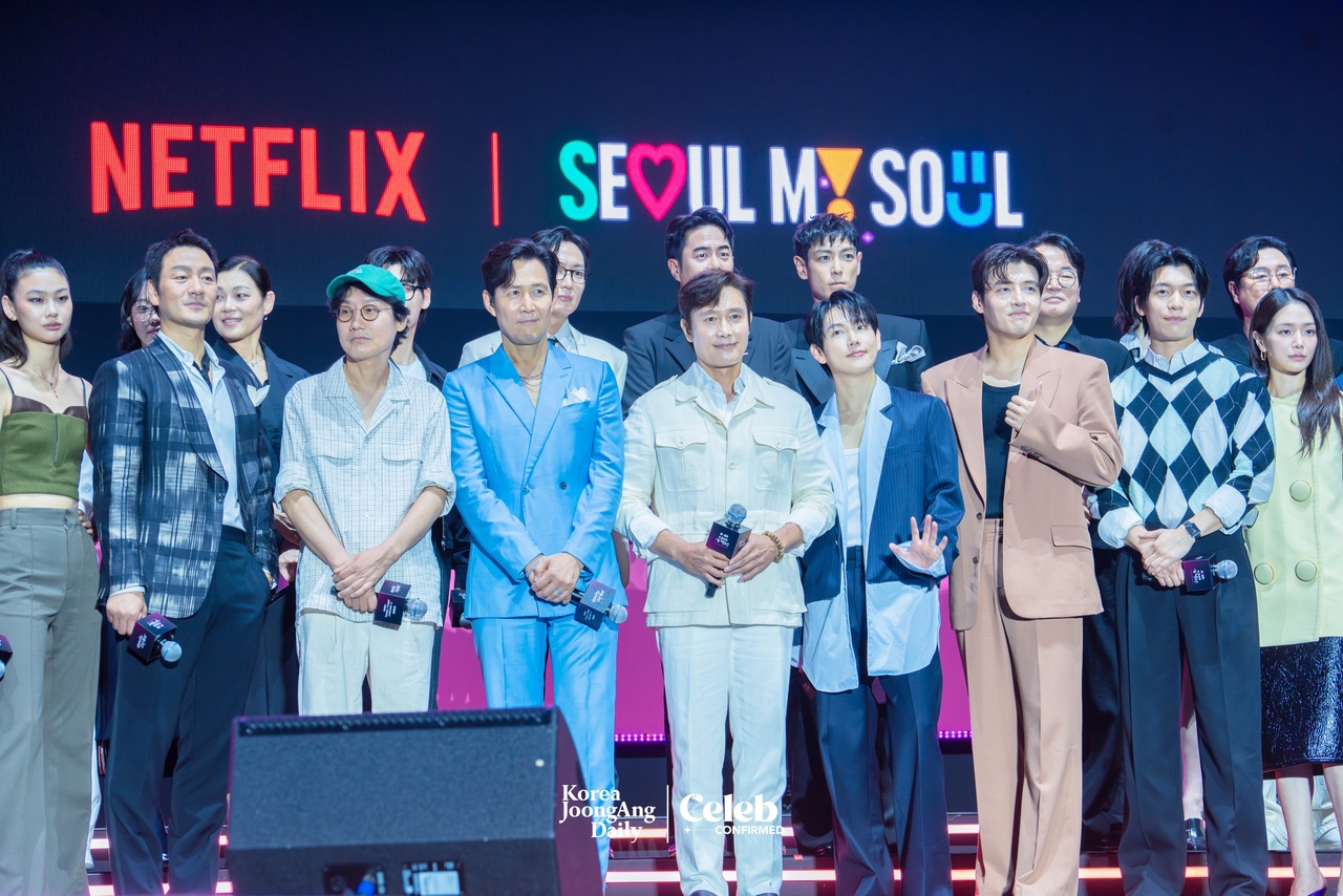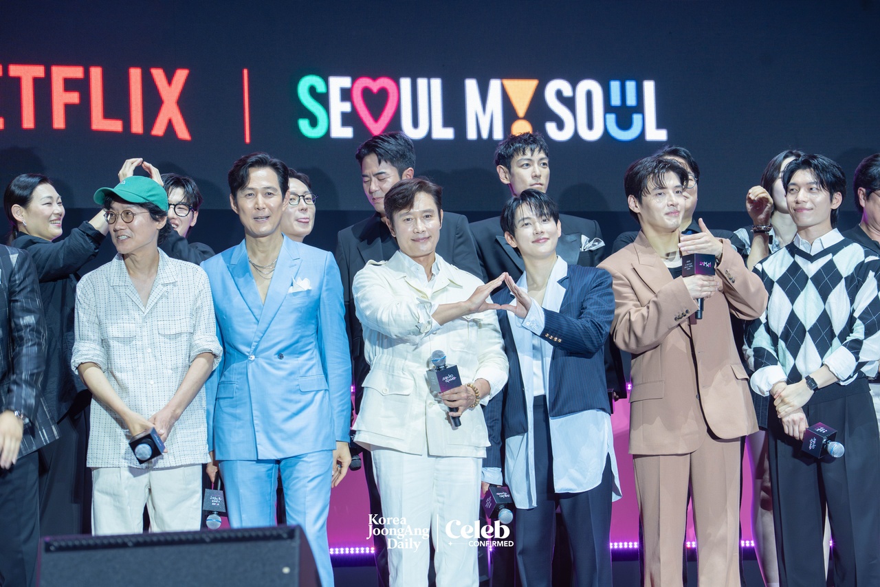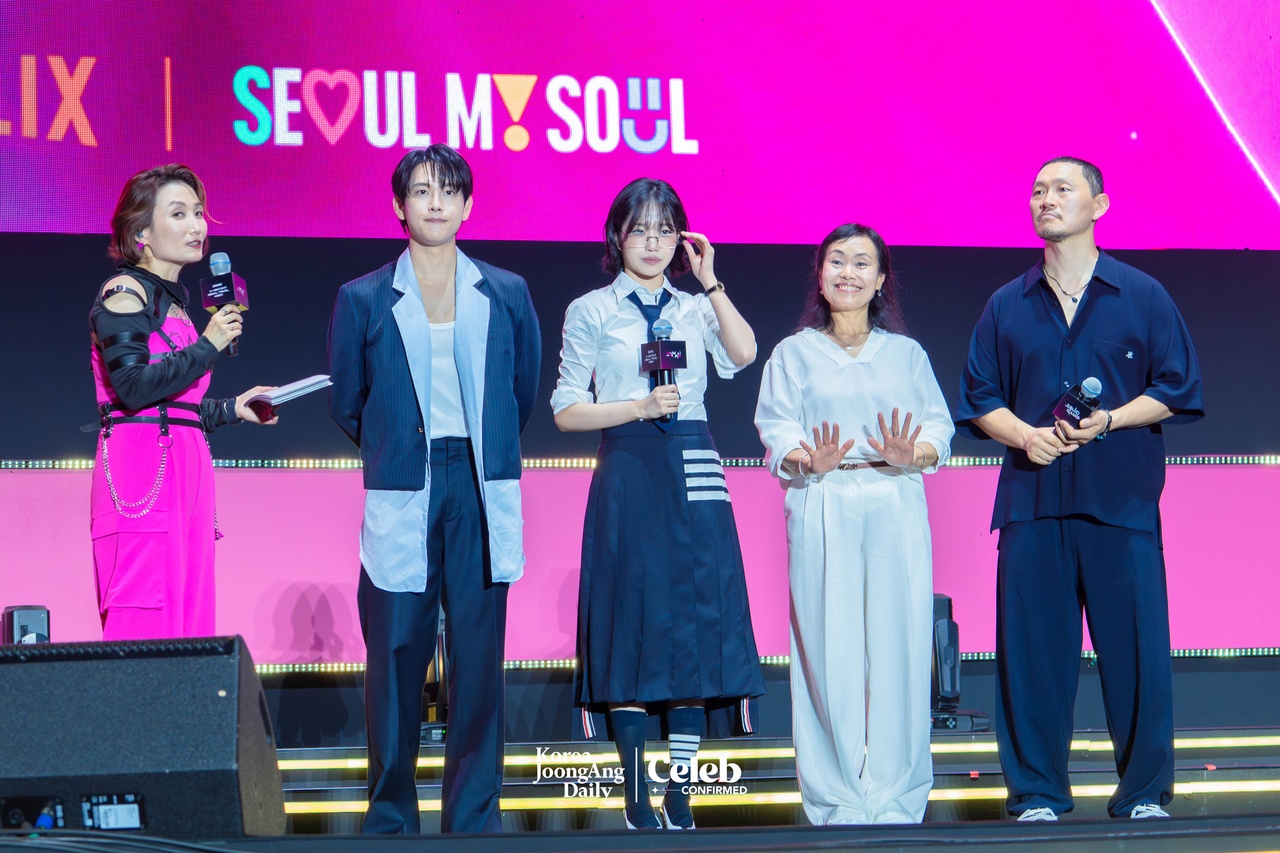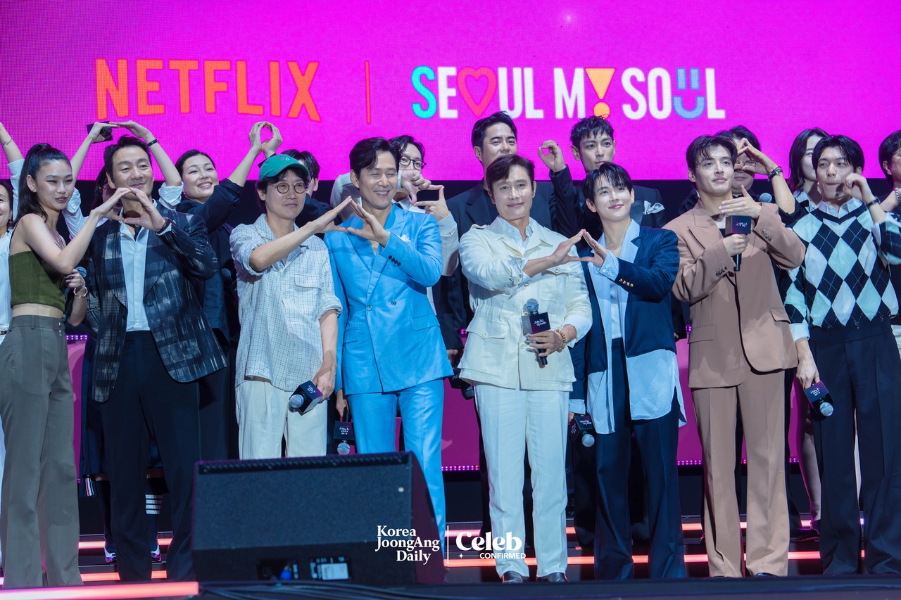 The cast of the third season of “Squid Game” during a fan event for the release of the third season of “Squid Game” (2021-) at Seoul Plaza in central Seoul on June 28. [DANIELA GONZALEZ PEREZ]