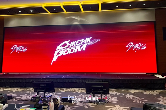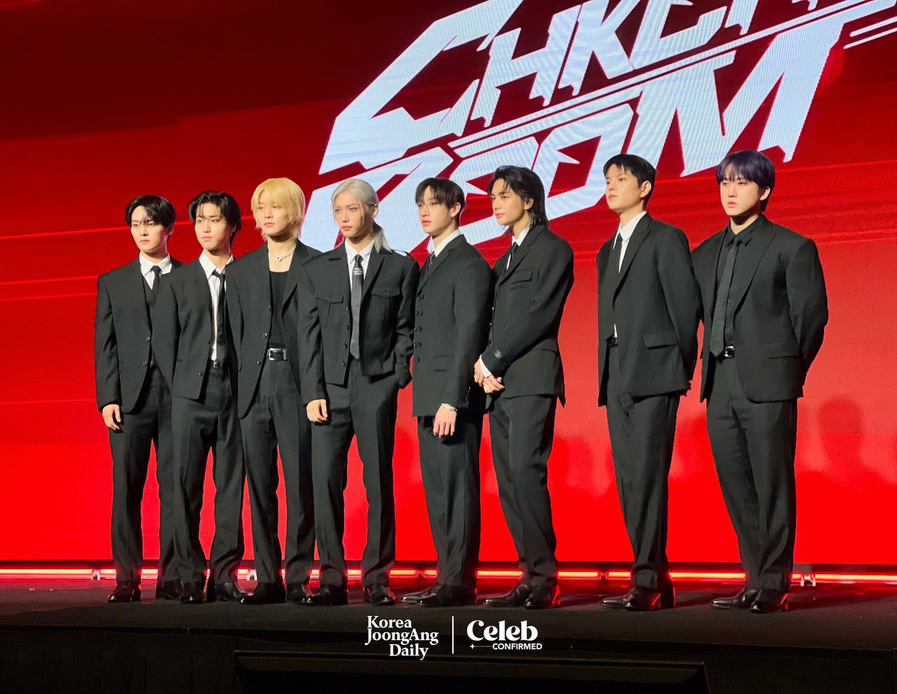 Stray Kids enters the conference hall at 11 a.m. They take a group photo as they enter.