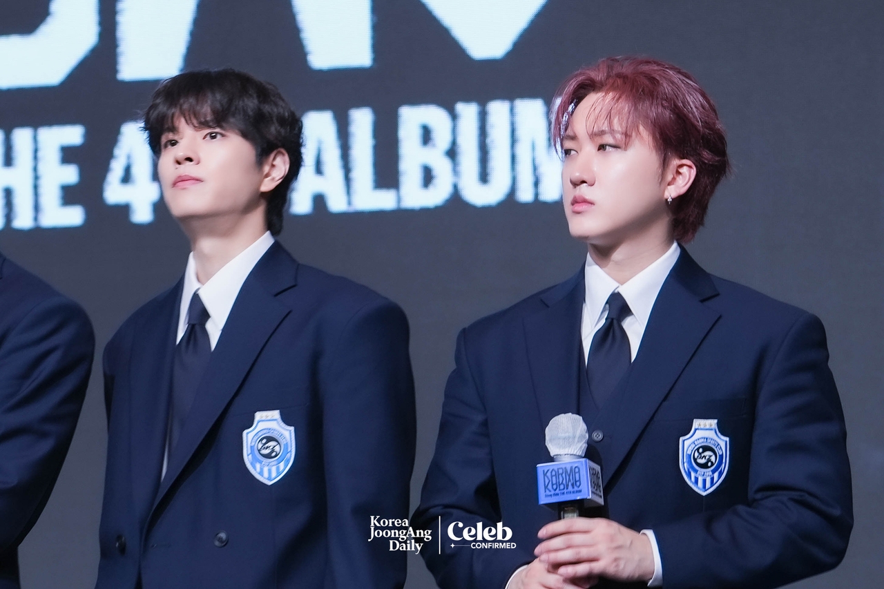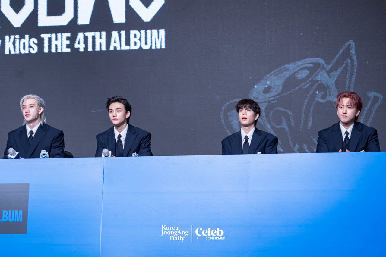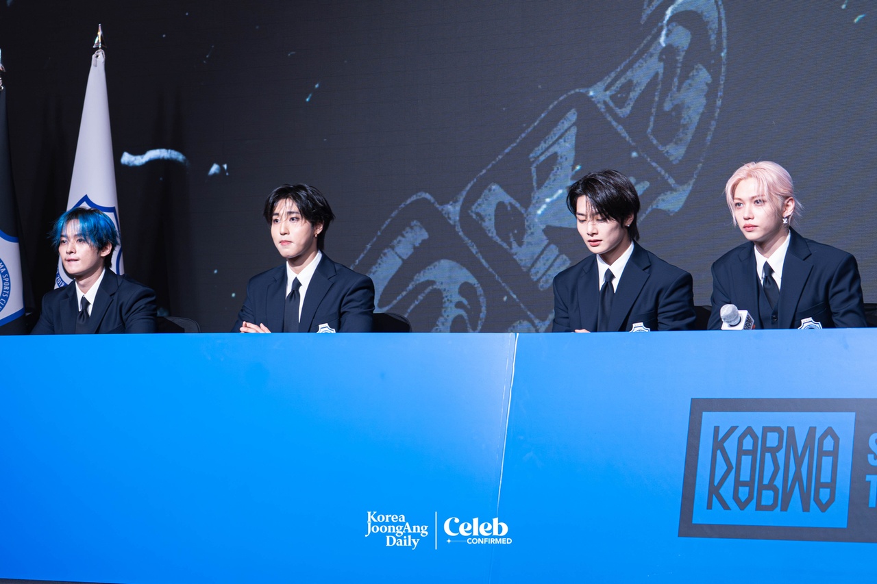Boy band Stray Kids held a news conference on Friday at the Conrad Hotel in western Seoul, just hours before the release of its fourth full-length album “Karma.”