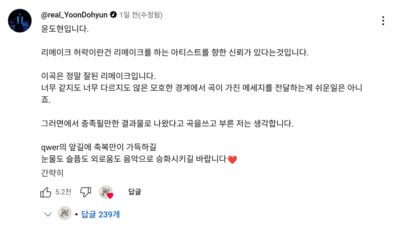 "I am Yoon Do-hyun," the singer wrote in a comment on QWER's "Blue Whale Official Special Clip," which was uploaded on Monday, through his YouTube channel account.